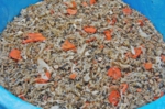 野菜、野草、 果物、海藻を細かく刻み微生物の餌となる黒糖等の糖質を混ぜながら樽に仕込む。