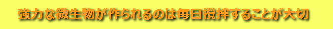 熟成させている過程で毎日朝と夕に人工的に攪拌し、植物酵素原液に酸素を入れてやります。酸素を入れることによって、各種微生物の間に保たれていた力のバランスが崩れ、再び微生物の精力争いが始まり死滅する菌や繁殖する菌も出てきます。毎日2回の攪拌を1年以上繰り返すことによって強い微生物がいっそう強くなります。